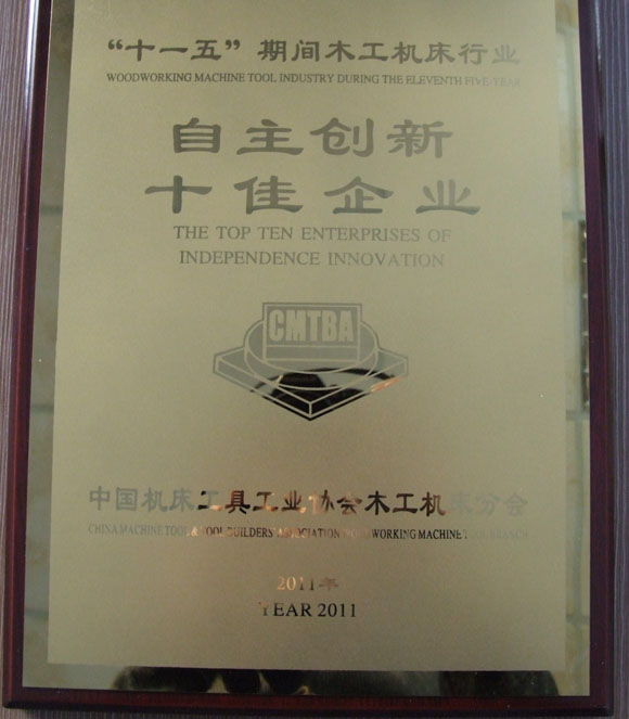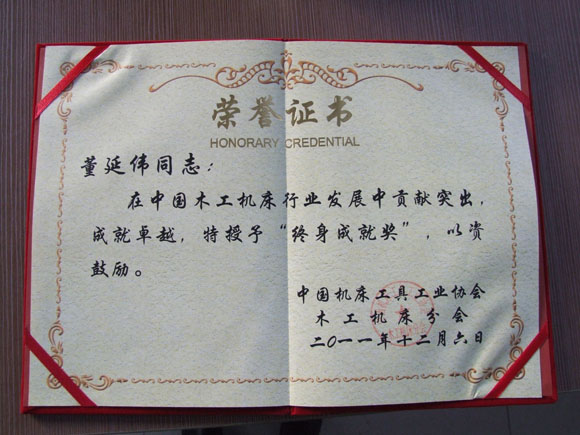 在中國(guó)機(jī)床工具工業(yè)協(xié)會(huì)木工機(jī)床分會(huì)的表彰大會(huì)上,公司被授予木工機(jī)床行業(yè)十一五“自主創(chuàng)新十佳企業(yè)”稱(chēng)號(hào),公司董事長(zhǎng)董延偉獲得中國(guó)木工機(jī)床行業(yè)“終身成就獎(jiǎng)”。